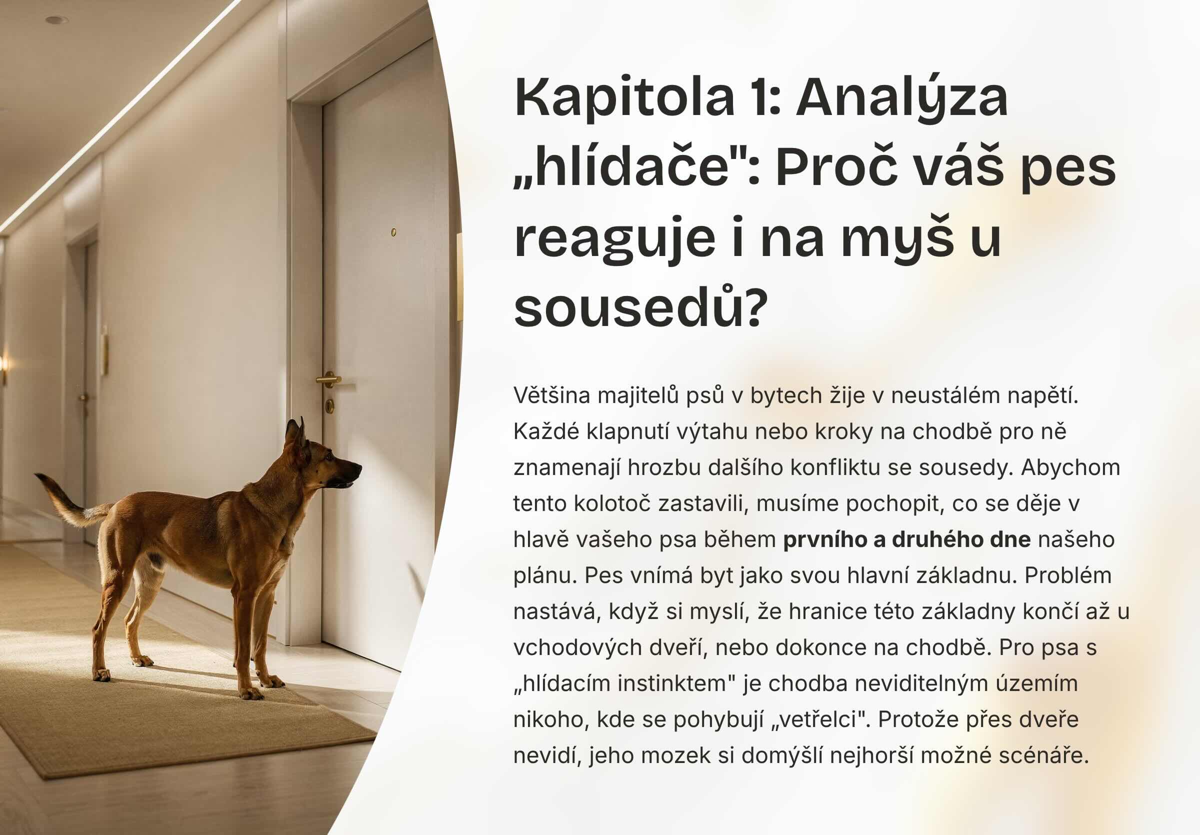Křik na štěkajícího psa situaci jen zhoršuje – pes má pocit, že se k jeho „vytí na nepřítele“ jen přidáváte. Tento e-book vás naučí strategii „Děkuji, vidím“, kdy psovi potvrdíte nahlášení hluku, ale okamžitě za něj přeberete zodpovědnost a pošlete ho odpočívat.
