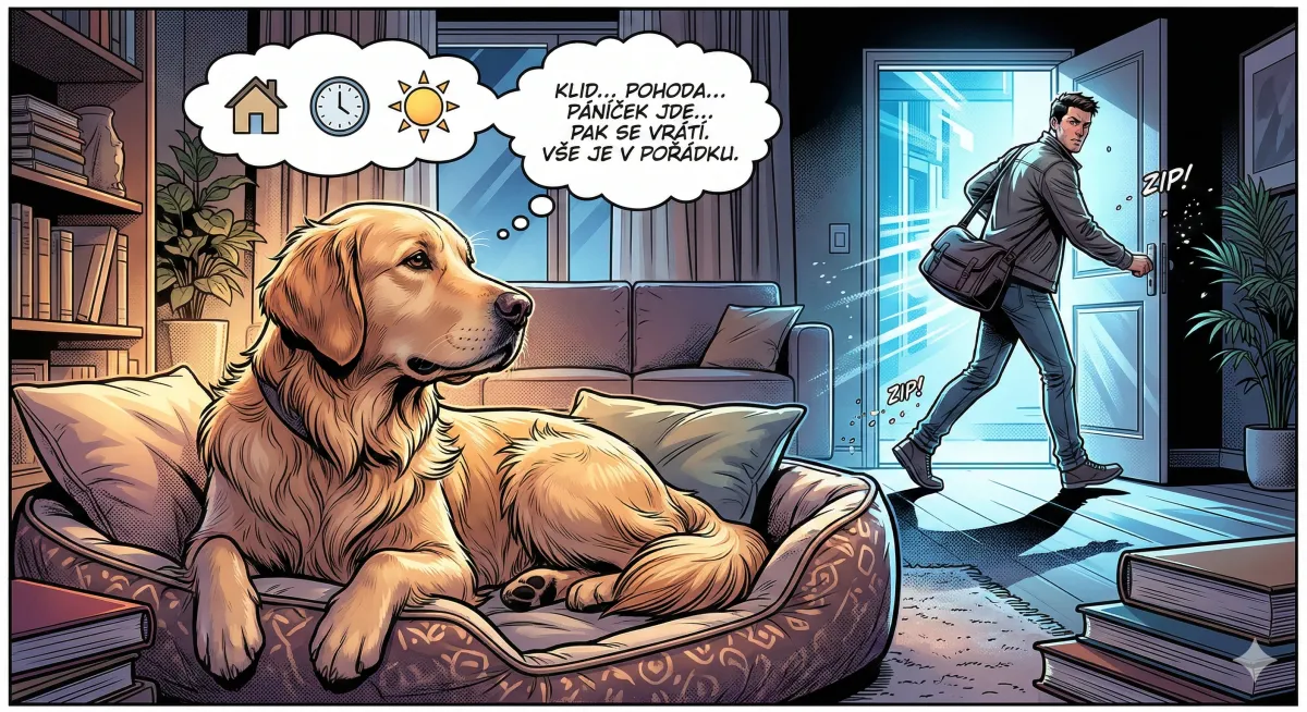 Tento problém řešíme v 5. kapitole. Naučíte se rozbít „odchodové kotvy“ (jako je cinkání klíčů nebo obouvání bot) a používat metodu „Zmizení a návratu“, díky které pes pochopí, že samota není konec světa.